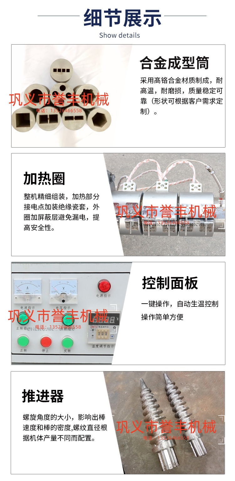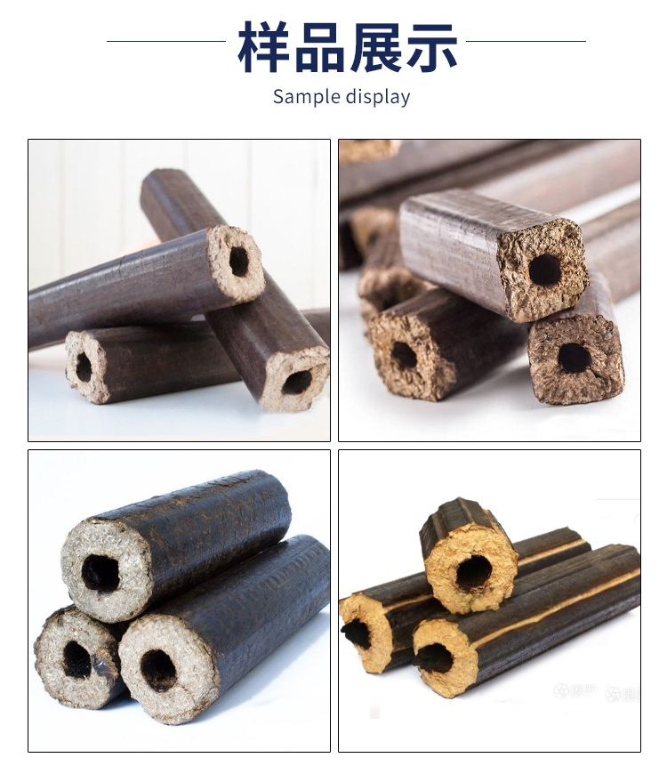 本機采用變螺距葉輪,將筒體后部的原料強力向前推進,原料在桶內體積受到壓縮后,通過前部成型頭擠出,形成炭棒,出來的炭棒形狀有多種,可以根據客戶要求制作形狀。